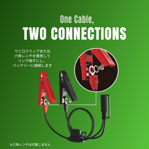 ・ワニ口クリップとリング端子が付属。ネジ留めされた一体構造で、ネジを外すことで両方の用途で使用可能です。